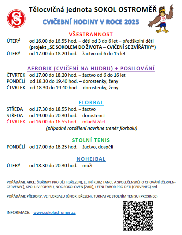 Cvičební hodiny Tělocvičné jednoty Sokol Ostroměř v roce 2025, více v příloze