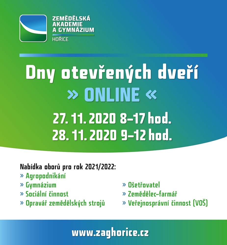 Zemědělská akademie a Gymnázium Hořice zve zájemce na den otevřených dveří, který se koná 27. a 28. 11 . 2020.