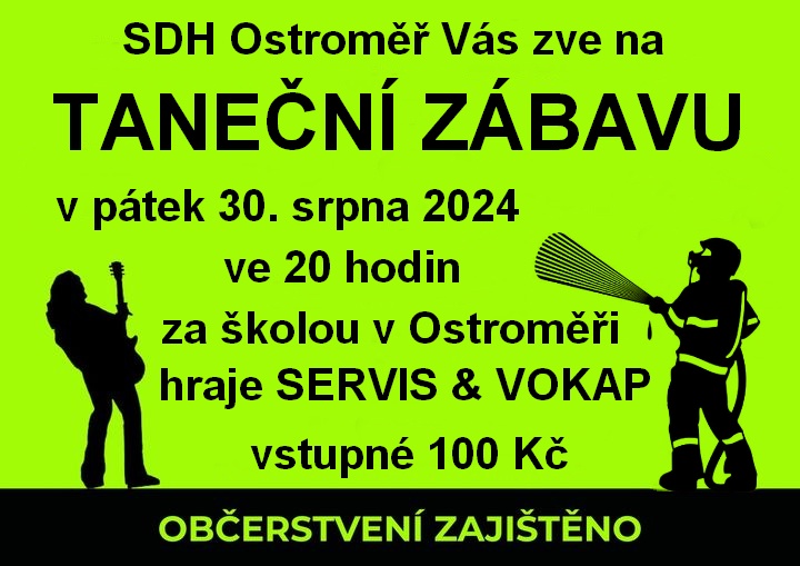 SDH Ostroměř Vás zve na TANEČNÍ ZÁBAVU za školou v pátek 30. srpna 2024. Začátek ve 20 hodin. Hraje SERVIS & VOKAP.