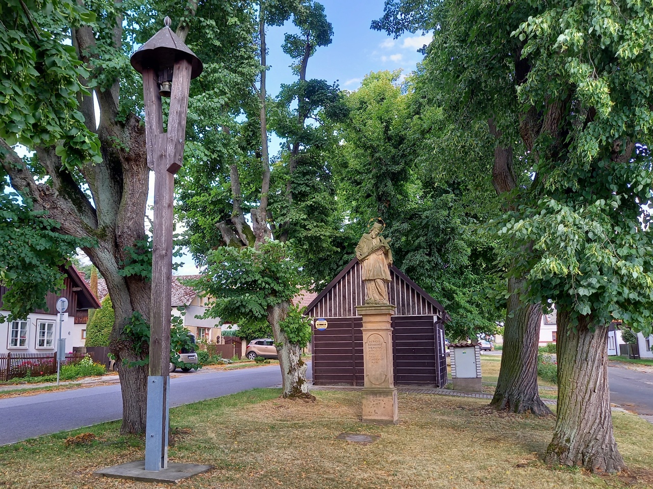 Zvonice a socha sv. Jana Nepomuckého na návsi
